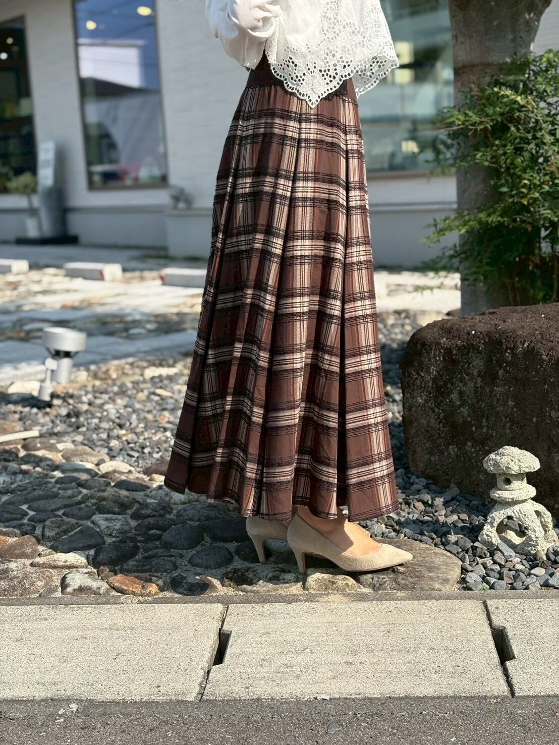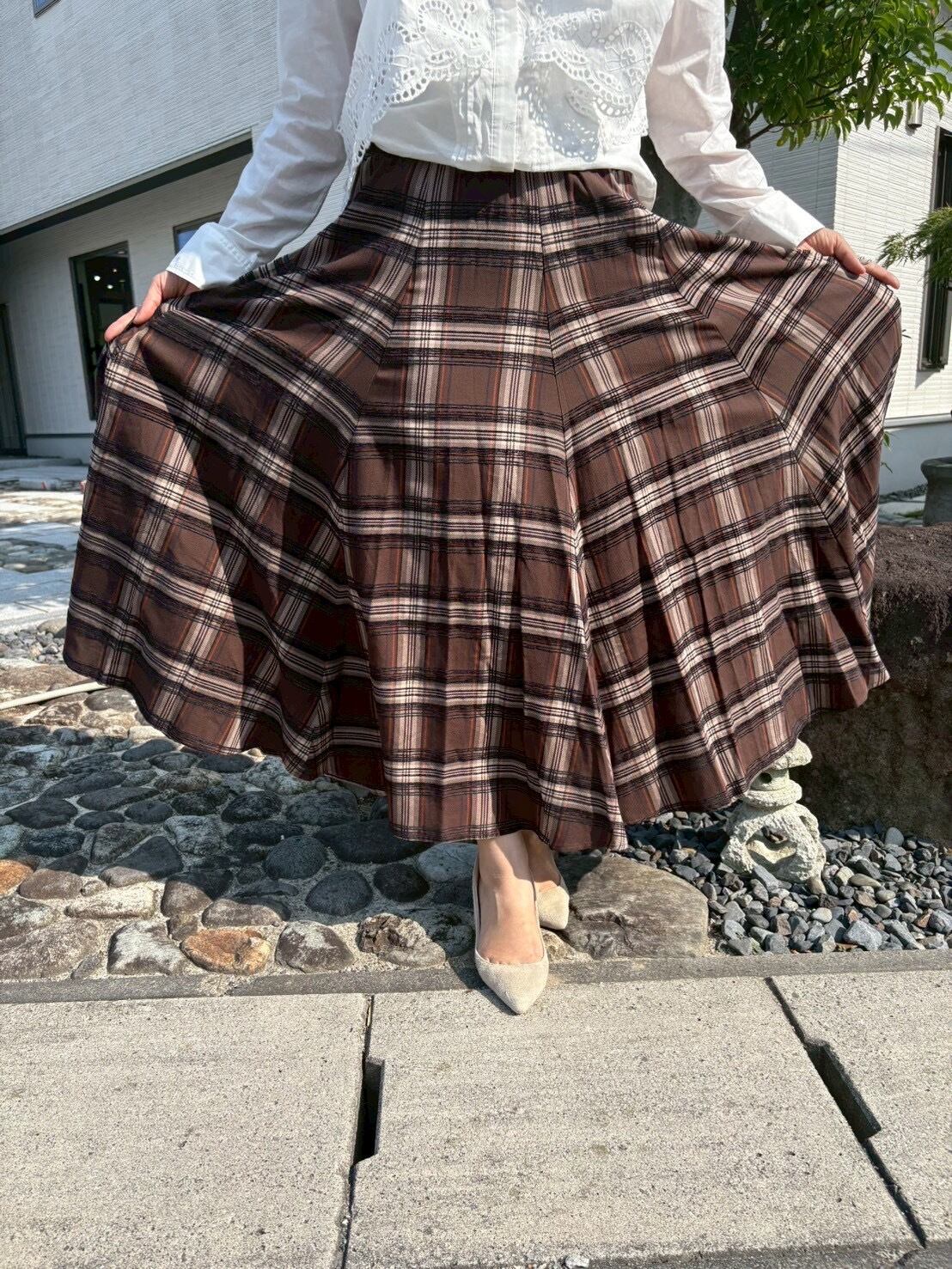 シーズンムードを高める上品なチェック柄フレアロングスカート。
