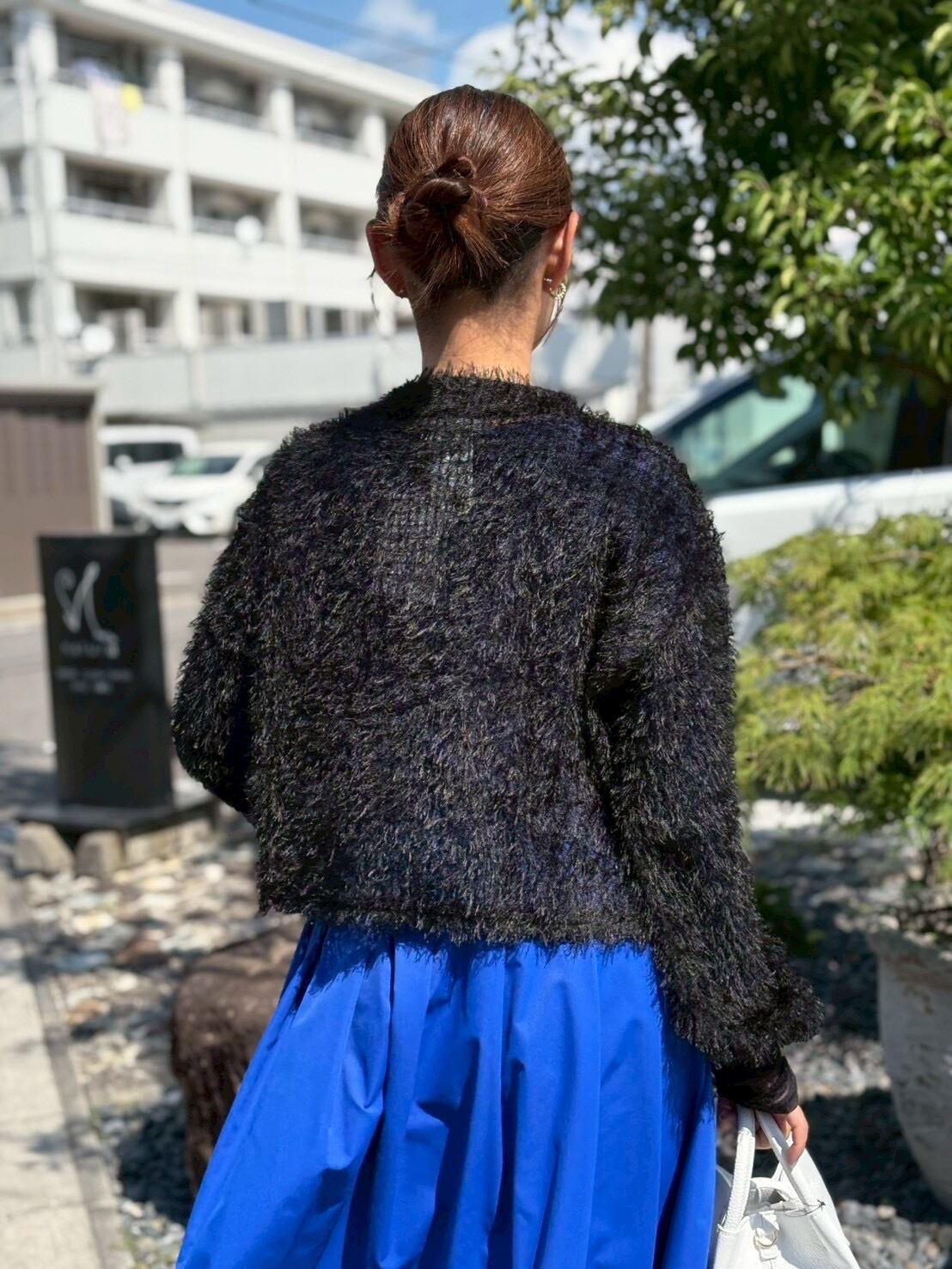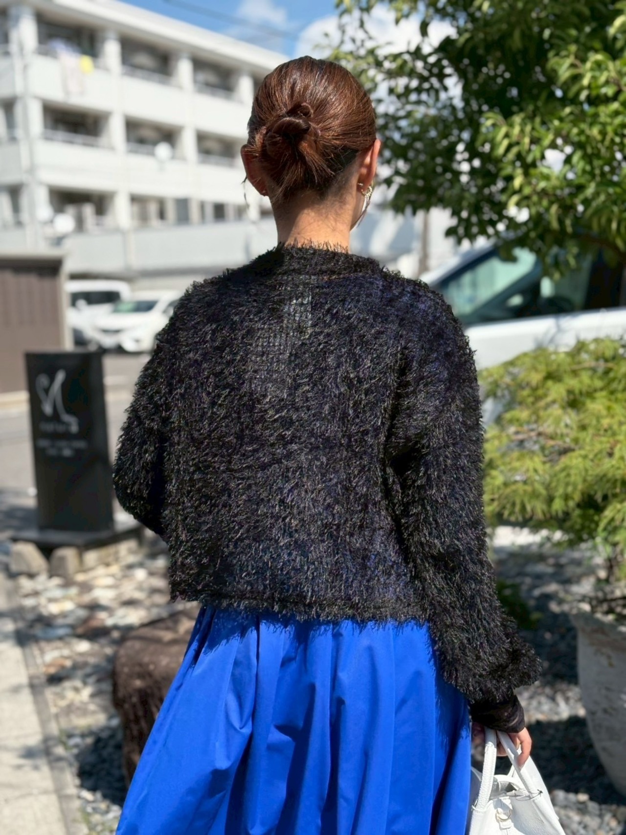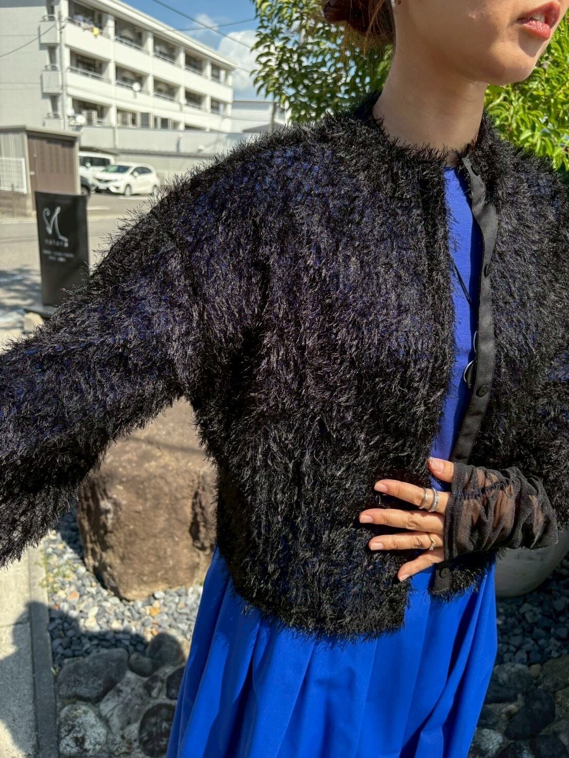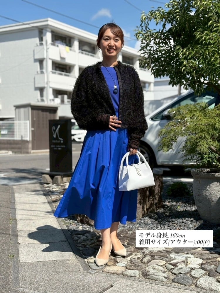 ソフトで華やかな表情のフェザーチュールが着映えするシアーカーディガン。