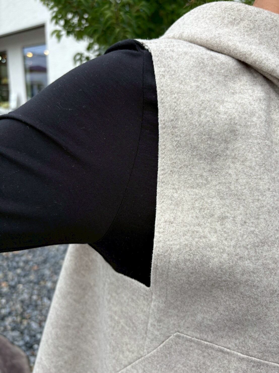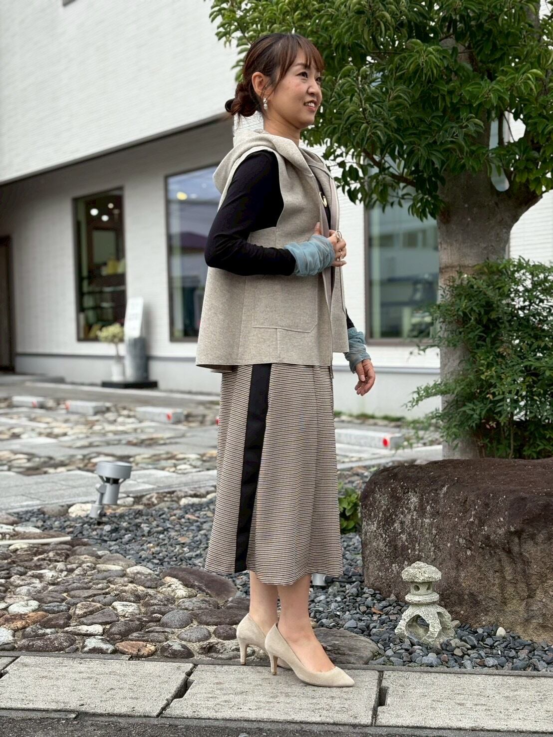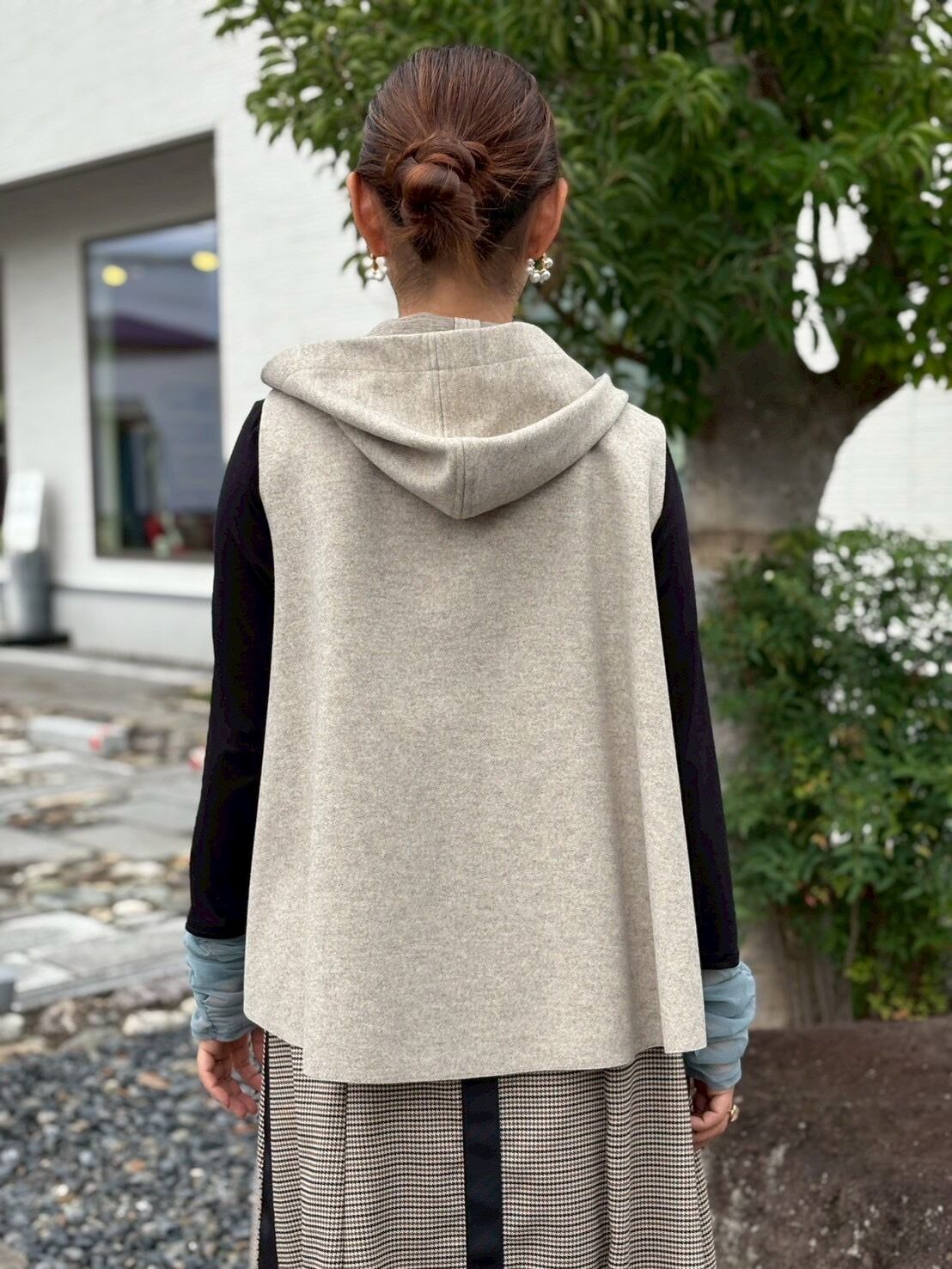 シンプルながら後ろさがりのフレアーシルエットが女性らしい、カットオフで仕上げた圧縮ニットのフーディベスト。
