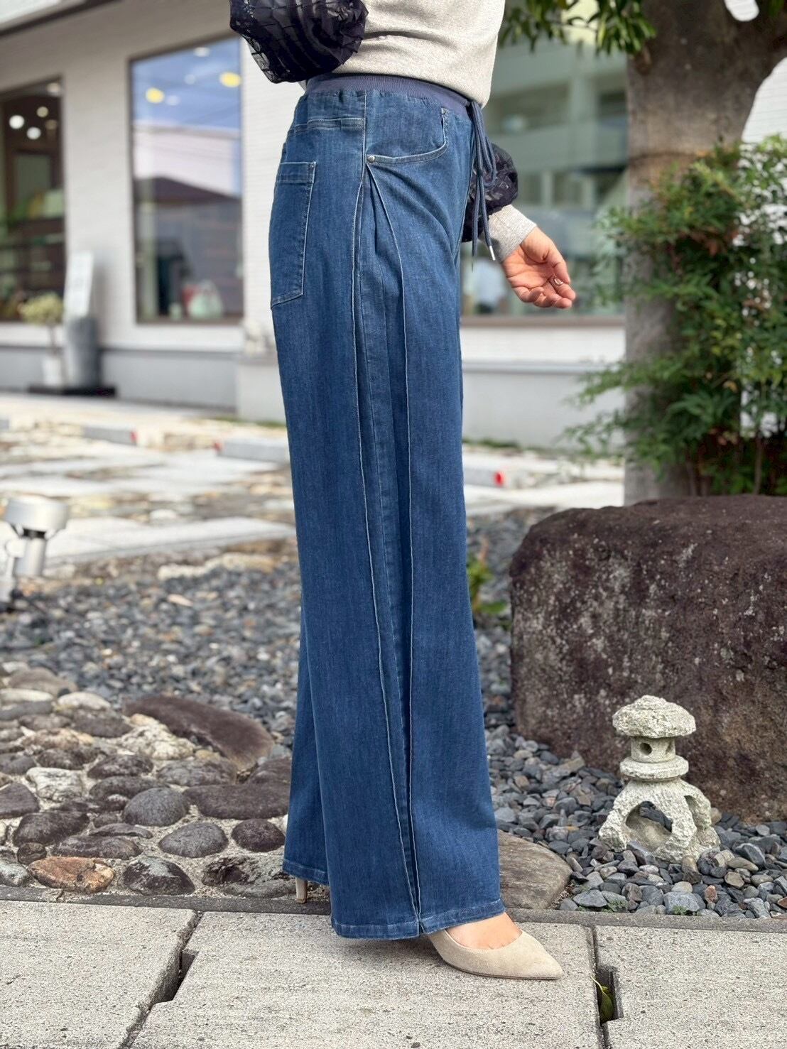 サイドの隠れたプリーツがおしゃれなデニムサイドプリーツイージーパンツ。