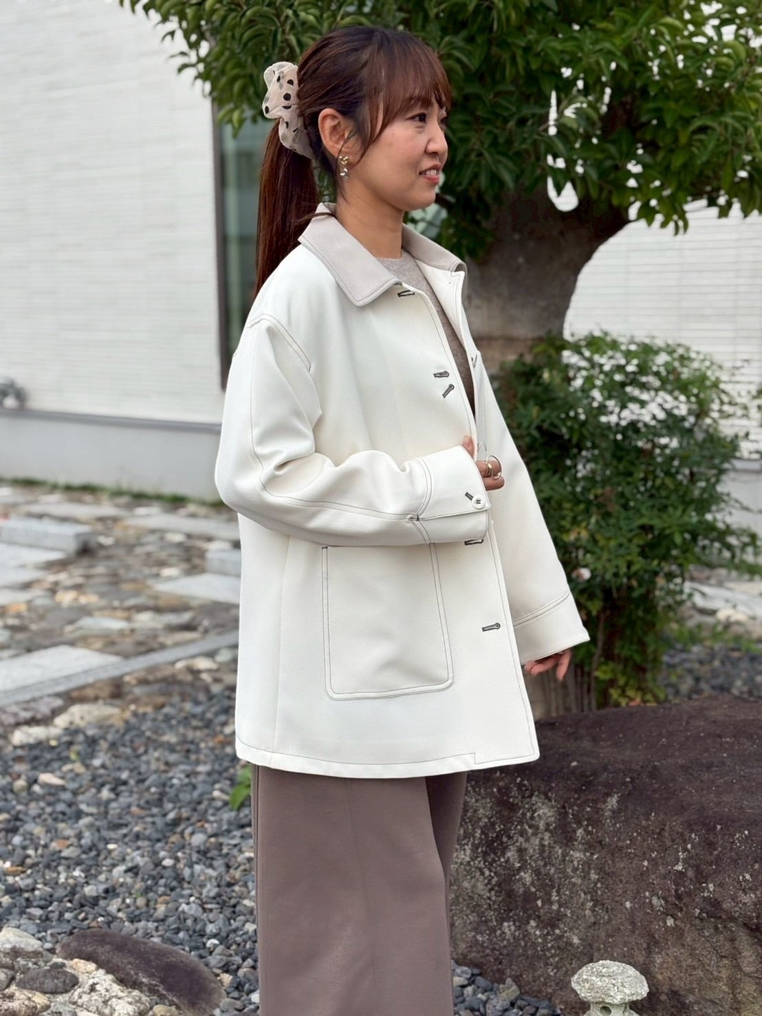 素材にはウールタッチの上品なファブリックを使用し、カジュアルながらも大人のきれいめスタイルにマッチします。