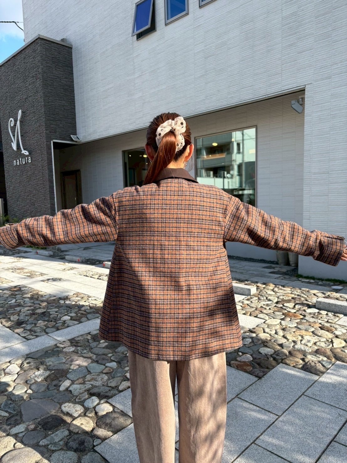 秋カラーのブリティッシュチェックと、クリーンな無地。