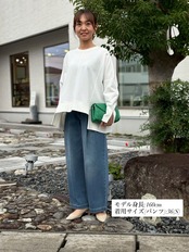 フロントに入った深いタックと、裾に向かってすとんと落ちるワイドシルエットが、脚を長く見せ、体型をカバーします。
