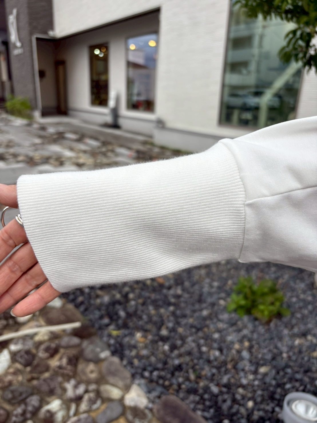 長めのリブ袖は、深いスリットが入っているので