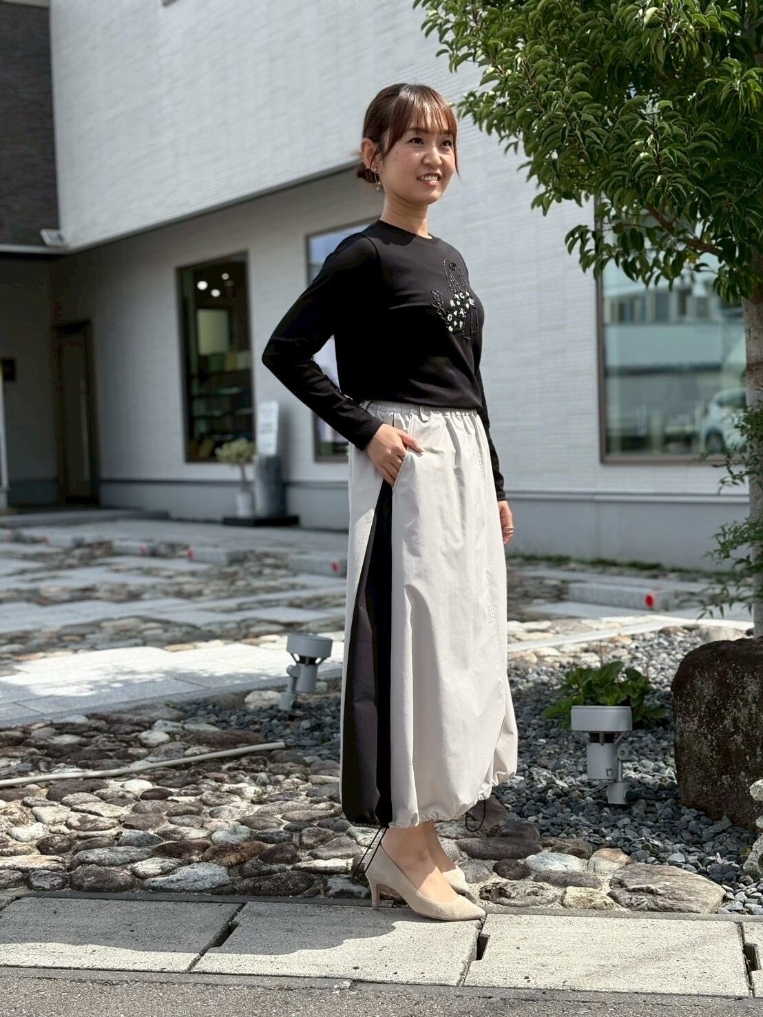 配色サイドがアクセントになるため、トップスは無地やワントーンでまとめて、スカートを主役にしたコーディネートが映えます。