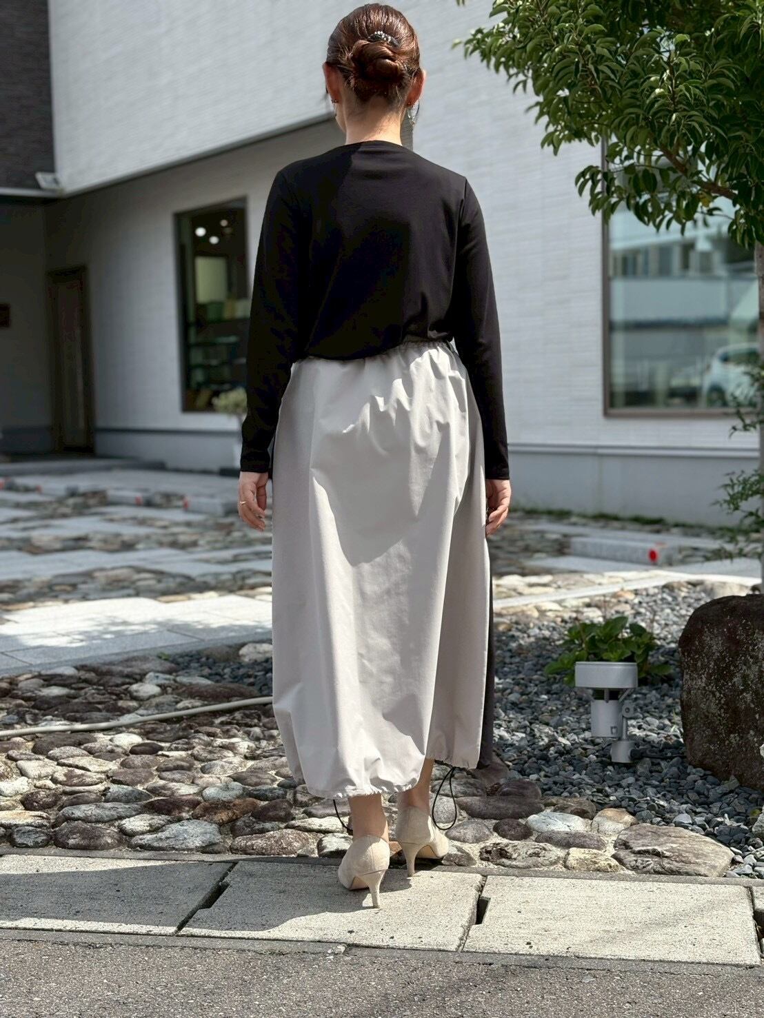 シルエットを絞ってバルーン風にすれば、コンパクトなトップスやショート丈アウターとの相性が抜群。