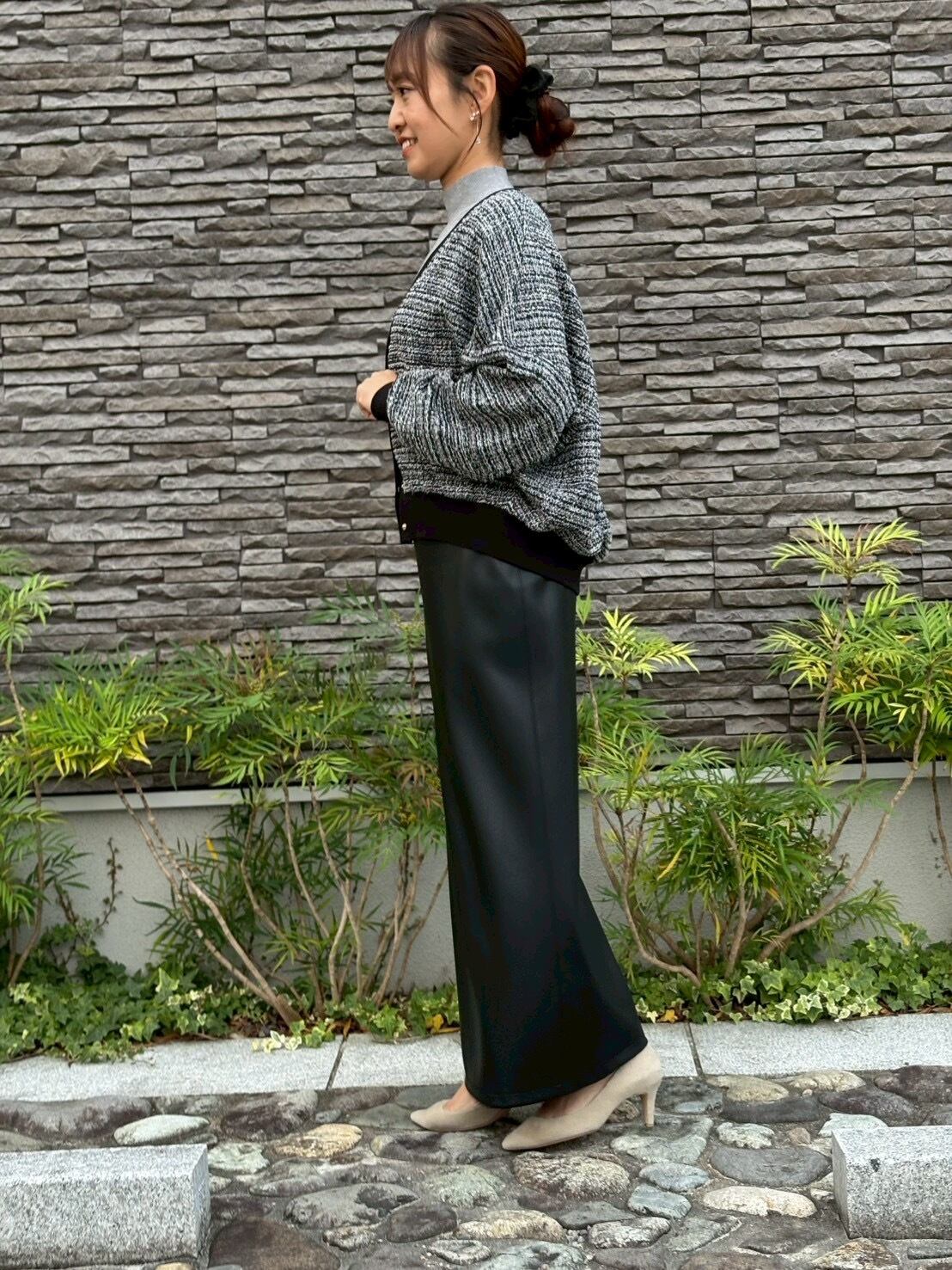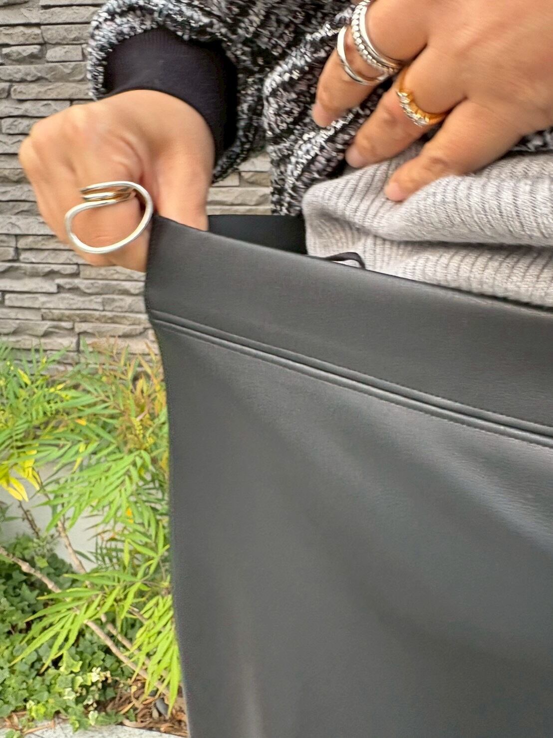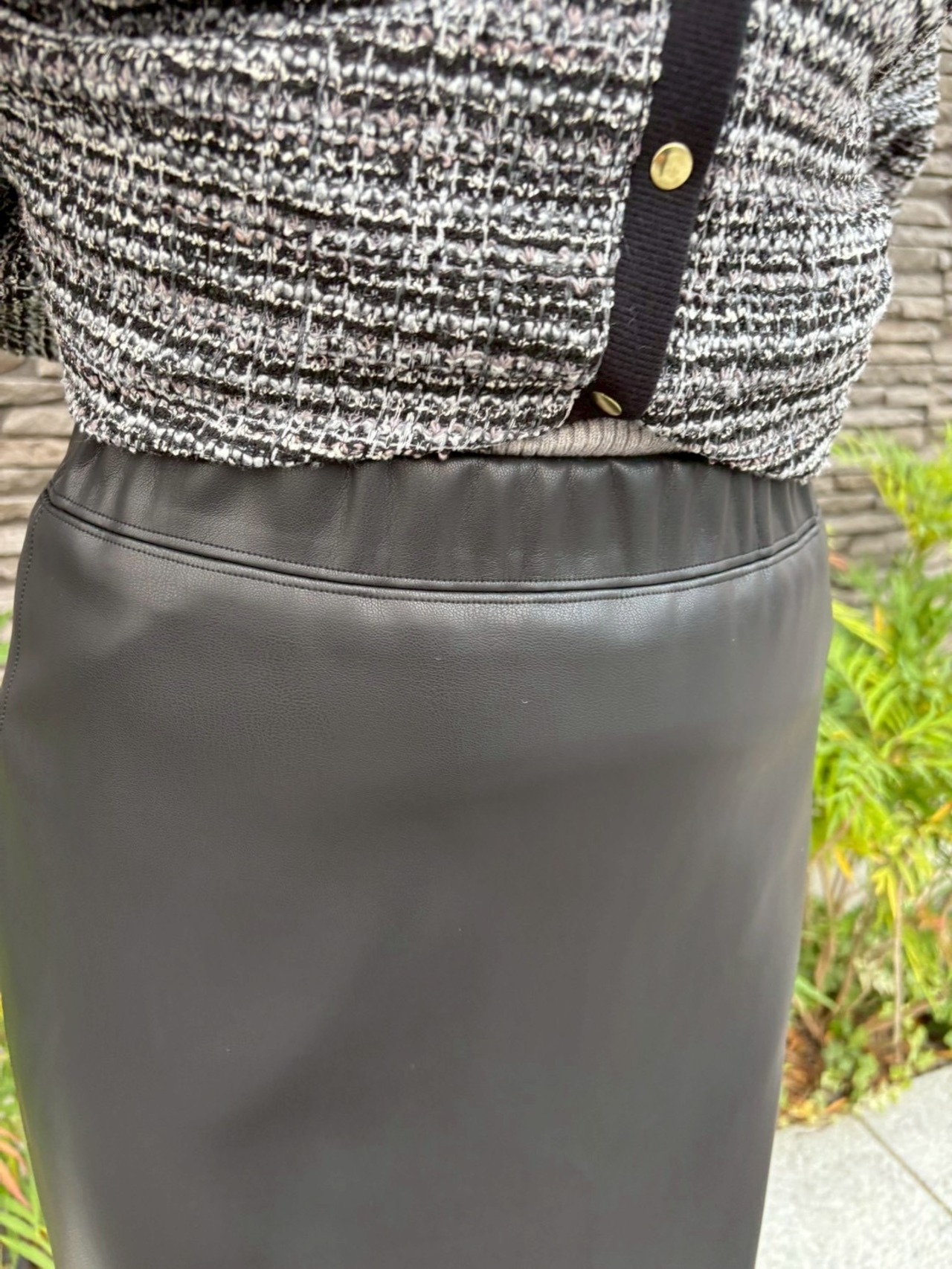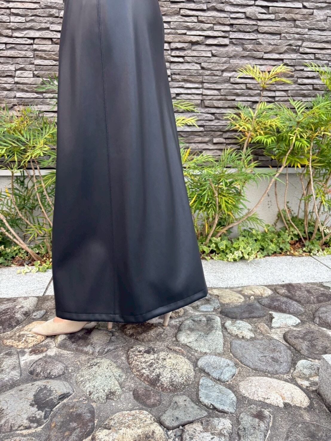 エコレザー素材のバックフレアースカート。シルエットの美しさが魅力なスカート。