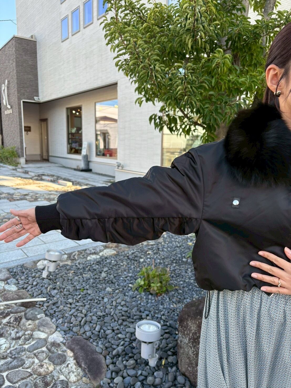 襟に豪華なリアルフォックスファーが付いたショート丈のMA-1ブルゾン。