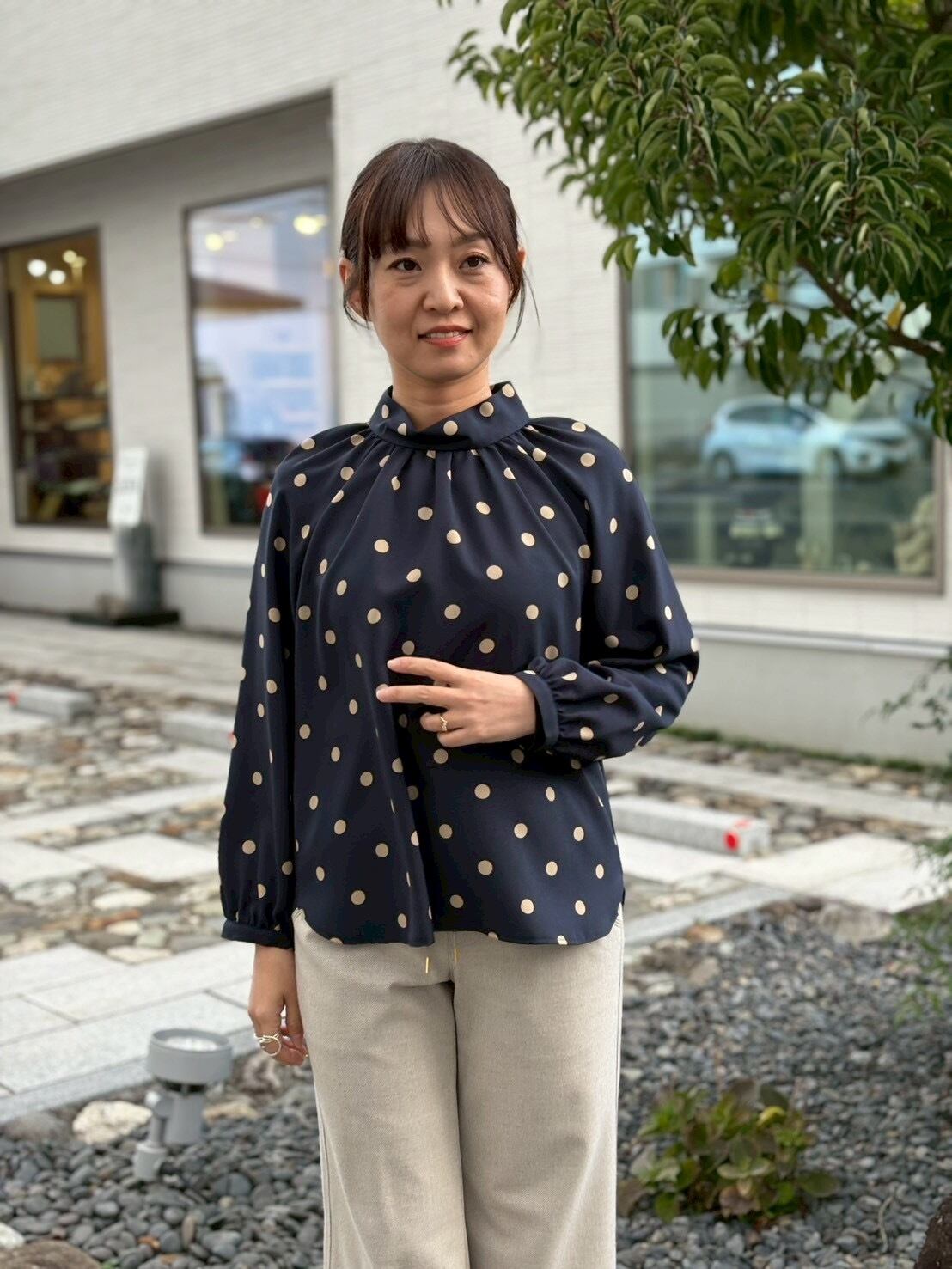 M-station エムステーション ギャザードット柄 ブラウス ネイビー