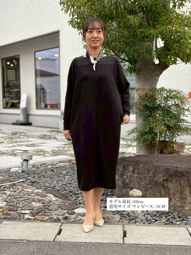 PUPULA ププラ ソフトポンチ 切替 シフォンネック ロングスリーブ ワンピース ブラック 黒