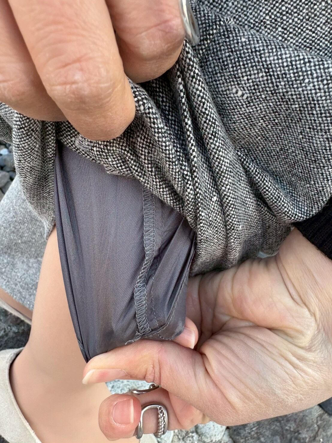 お仕事やキチンとしたい時にもコーデしやすいグレー系のツイード生地です。