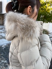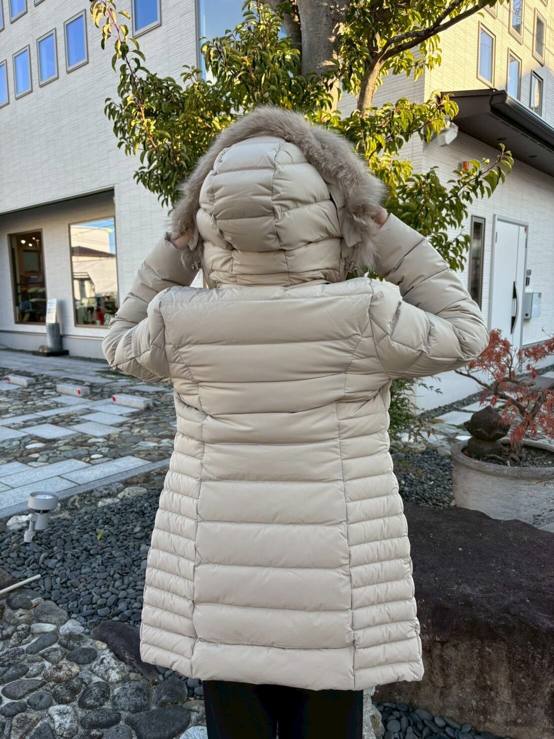 フードについた大ぶりなファーとマットな素材感がモダンかつエレガントな雰囲気をプラスします。