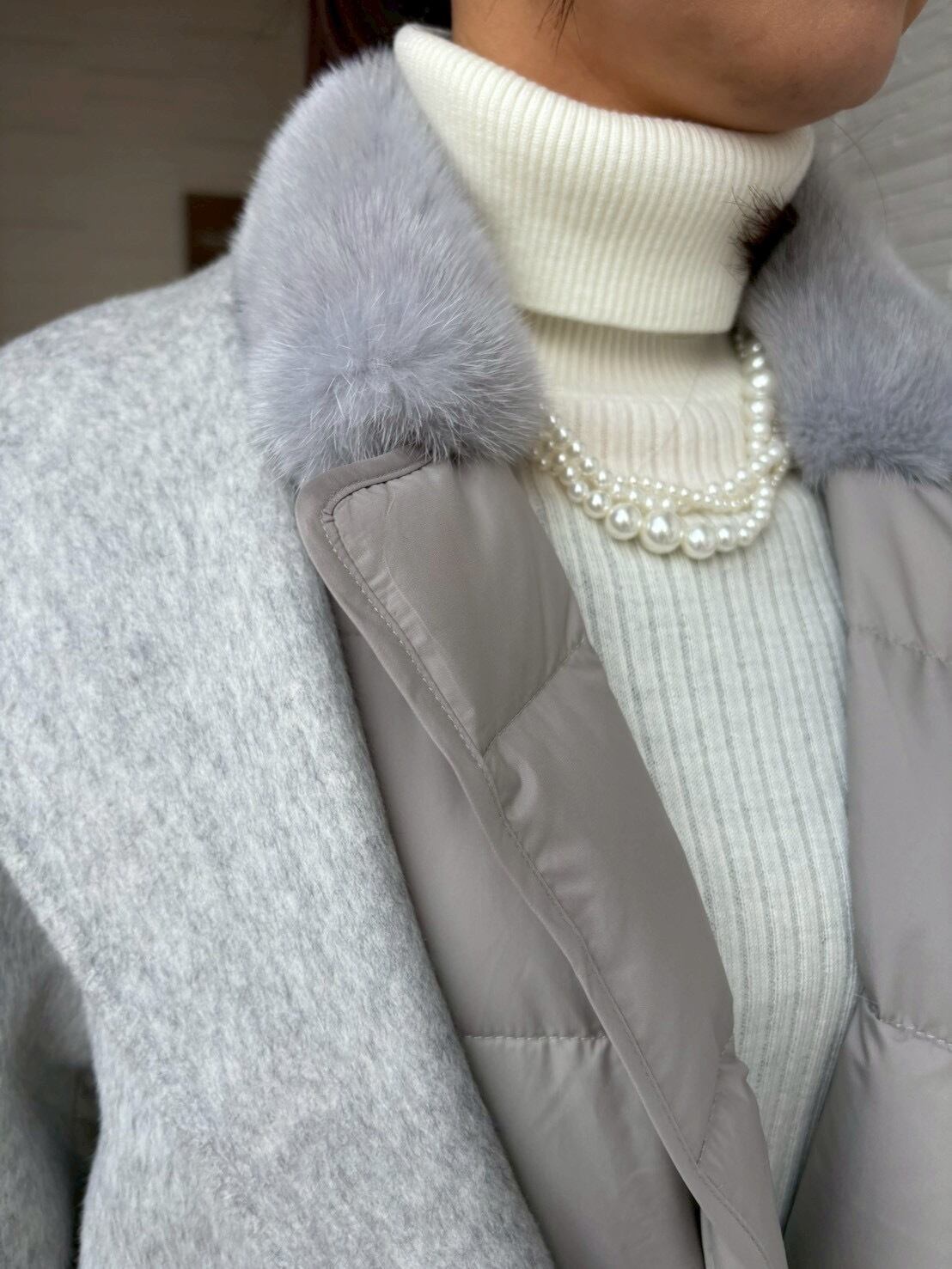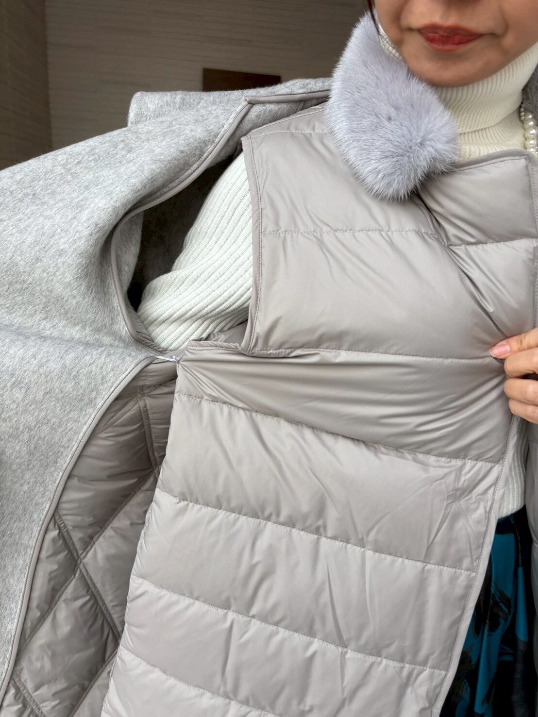 さらにインナーには、ロングダウンベストも付いていて、ダウンベストの襟には、上質なミンクが付いています。