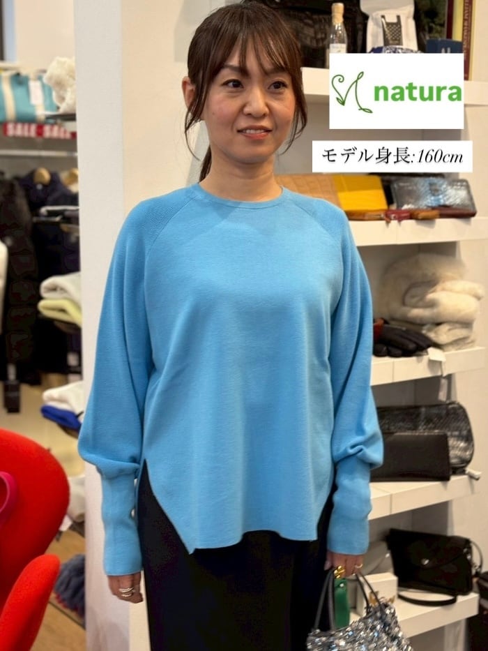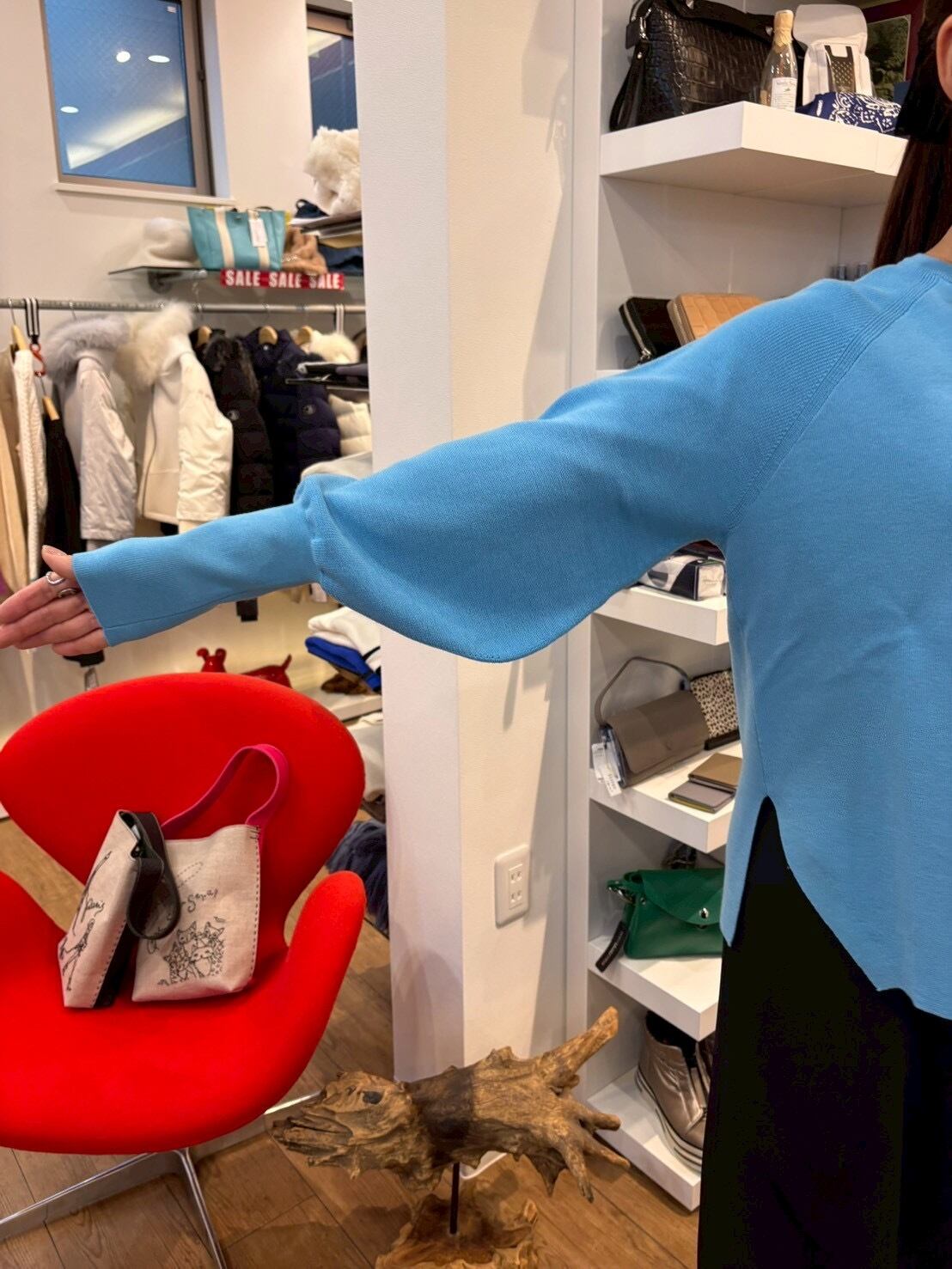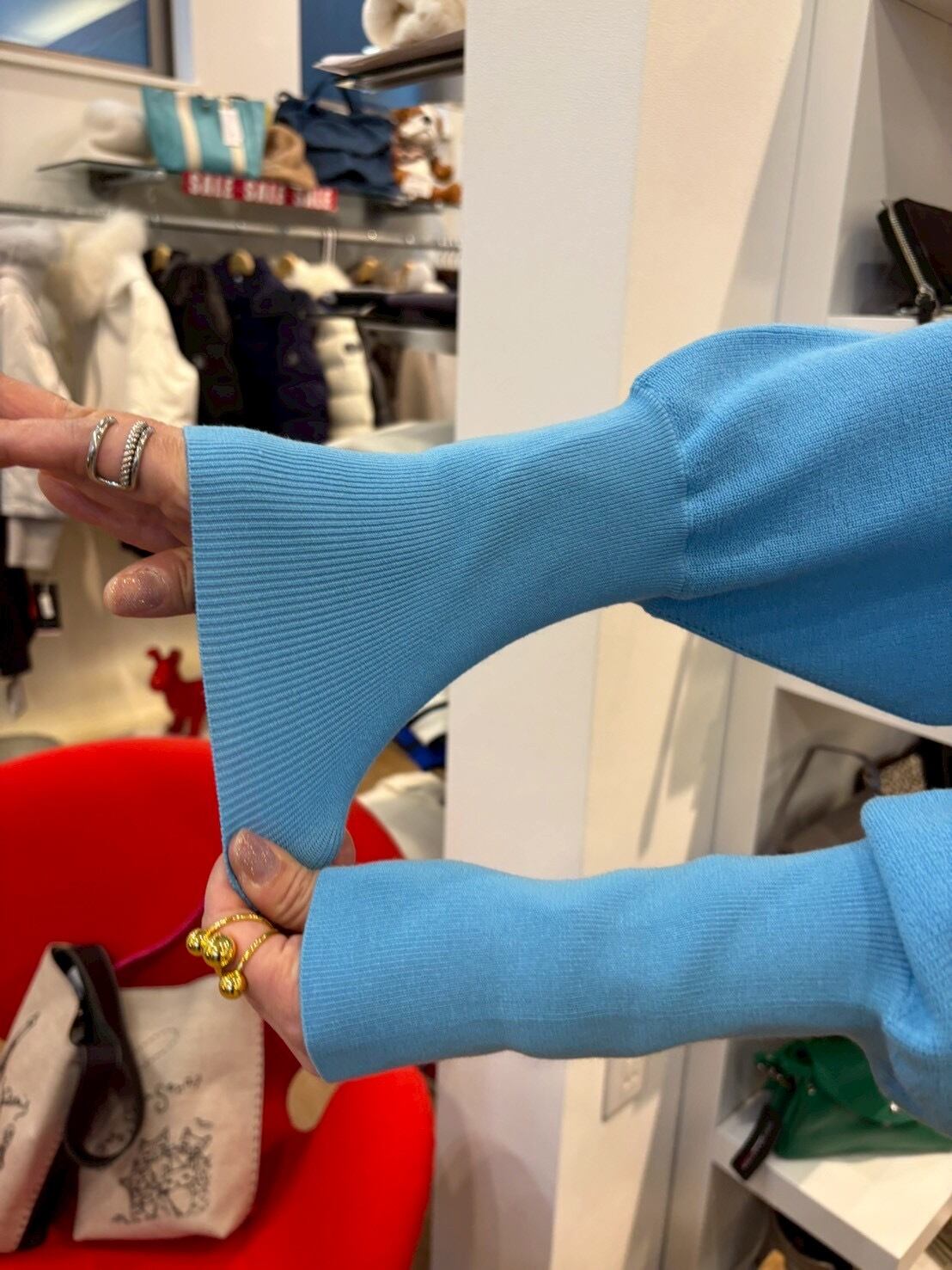 適度なボリューム感のあるアームと、長めのリブ袖のニット。