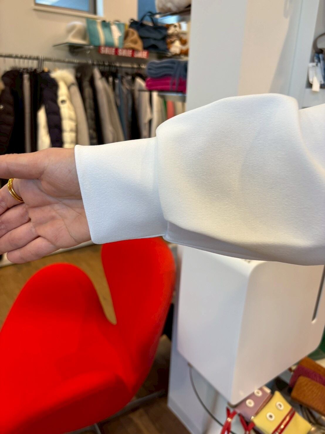 異素材のコントラストがシンプルなデザインに奥行きを与え、ふんわりと丸みのあるスリーブが女性らしさを引き立てます。