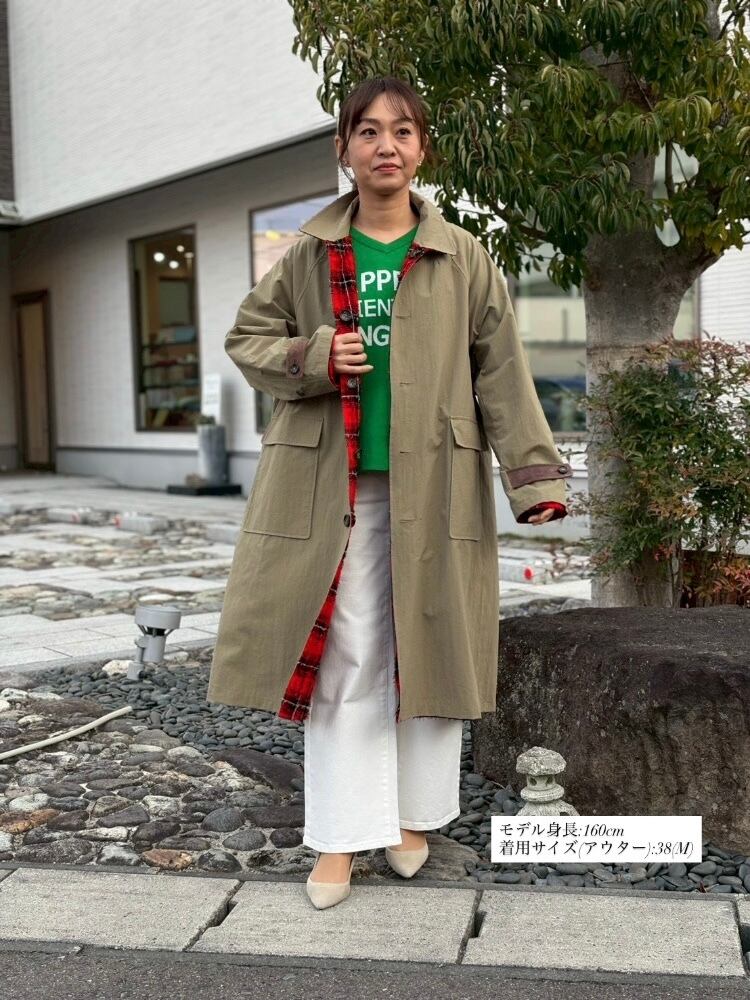 スパンレーヨン先染めチェックの緯糸を特殊な針でループ状に引き出した、立体感のあるオリジナルテキスタイル(HOEI USAMI SP)と、塩縮加工を施したナイロンタッサーとのリバーシブルコート。
