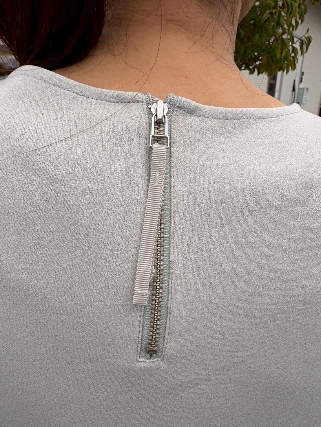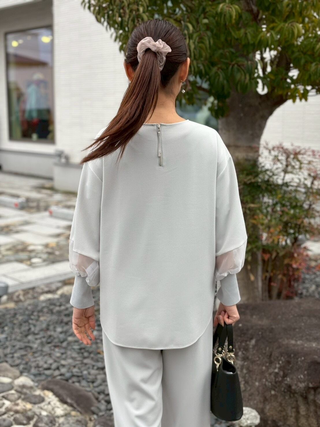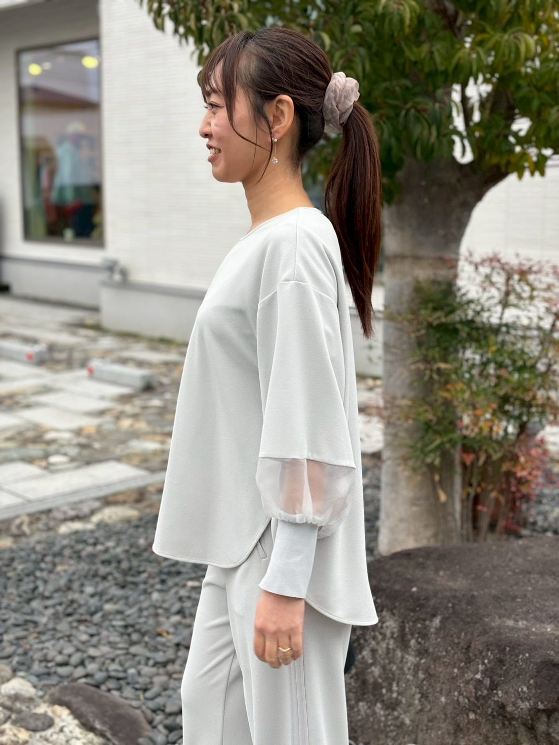 シアー 切替 スリーブ プルオーバー トップス 異素材 セットアップ ライトグレー