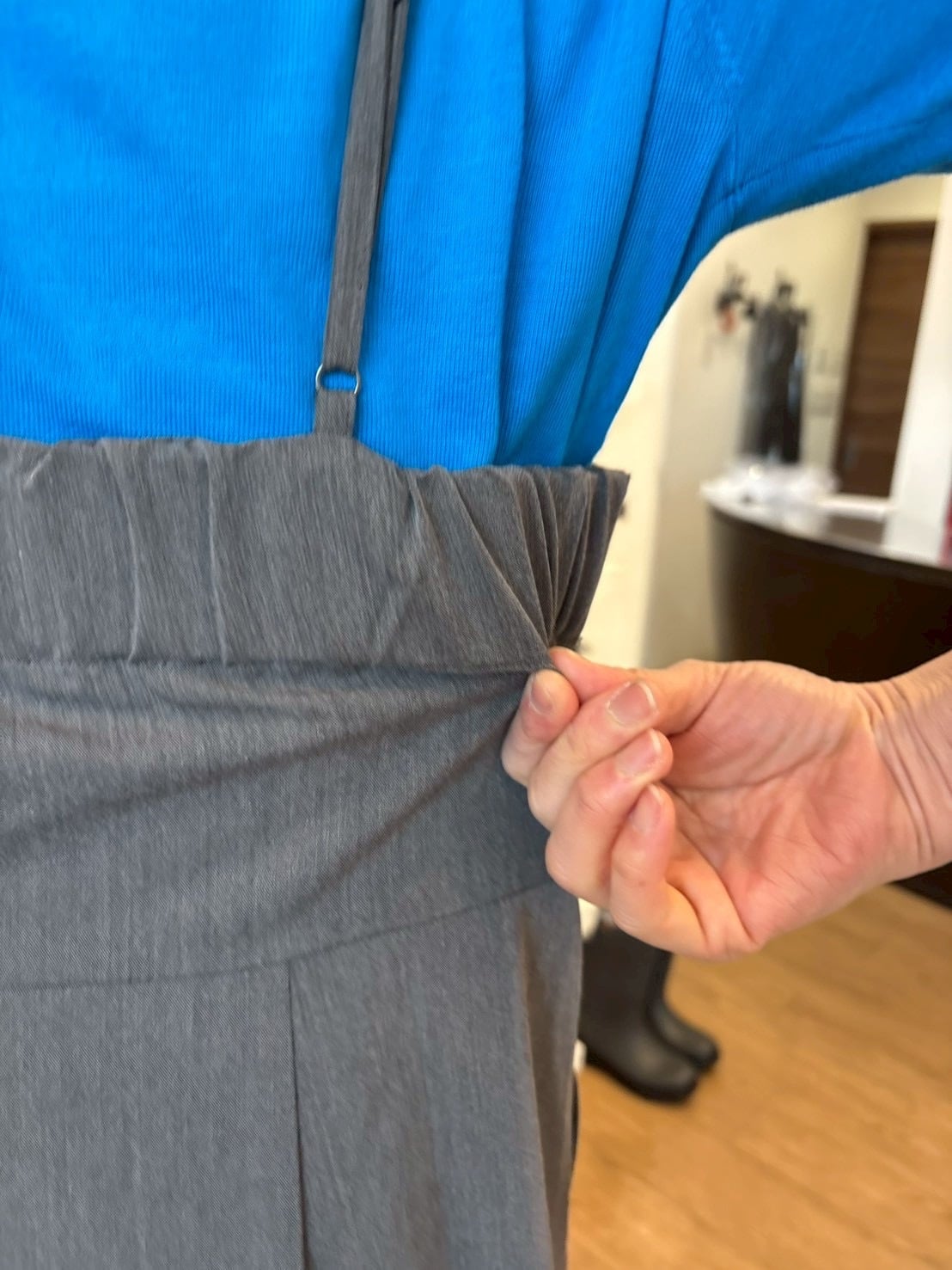 ウエストラインの切替え部分で、前後ともタックをあしらい、バックには平ゴムを通して身体馴染みよく考えられた身頃。