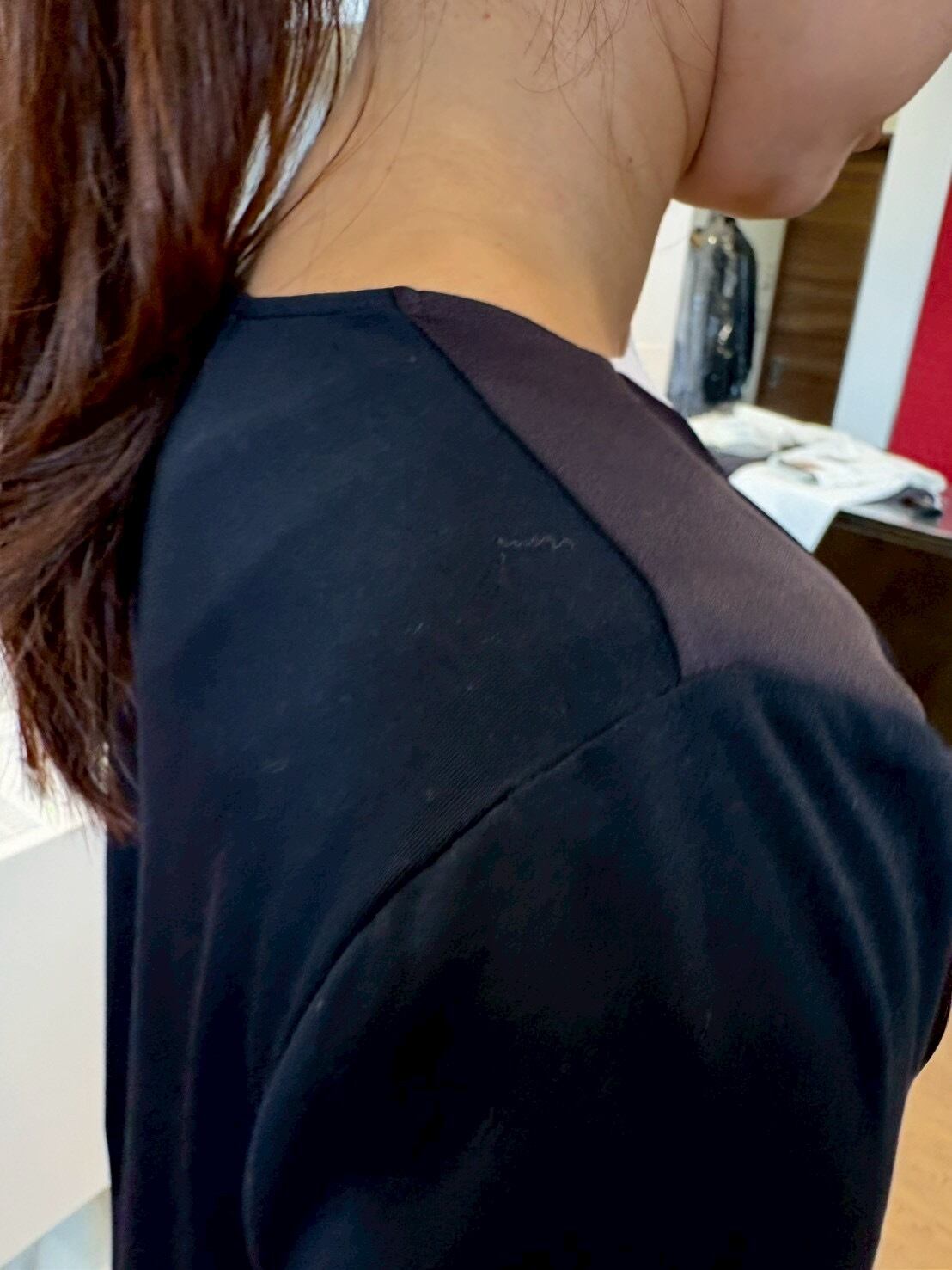 首元をすっきり見せるVネックと、肩線に入ったタックがシャープな印象のトップス。
